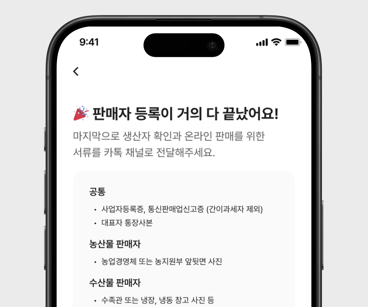 직팜에 가입하고 정보를 등록하신 뒤, 카카오톡 채널로 생산자 입점 서류를 보내주세요. 만약 7일 이내 서류 확인이 어려운 경우 계정이 비활성화 될 수 있습니다.