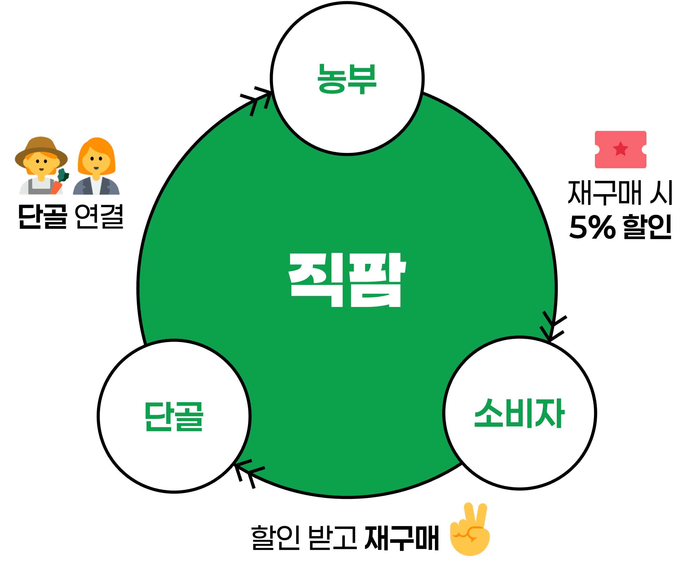 직팜에 수수료를 내는 대신, 내 상품을 재구매하는 단골 고객들에게 할인이 제공됩니다. 농부와 소비자 간의 지속적인 관계가 형성되는 것이 직팜 생태계의 목표입니다.